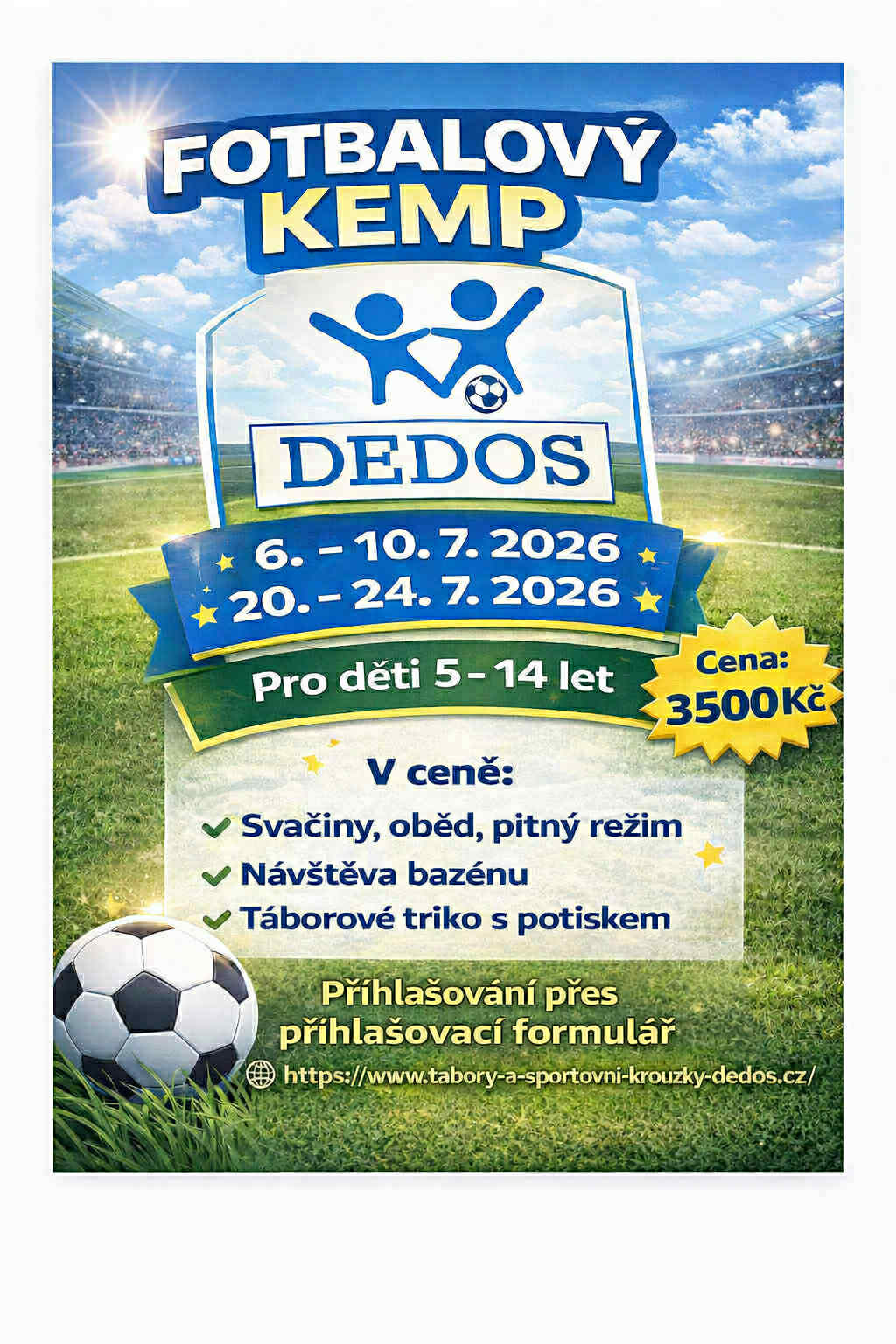 O prázdninách pořádáme oblíbené sportovní příměstské kempy zaměřené na fotbal a tanec a to pro děti od 5 do 14 let. Od léta 2025 přidáme i kempy zaměřené na více sportů. Těšíme se na Vaši účast.