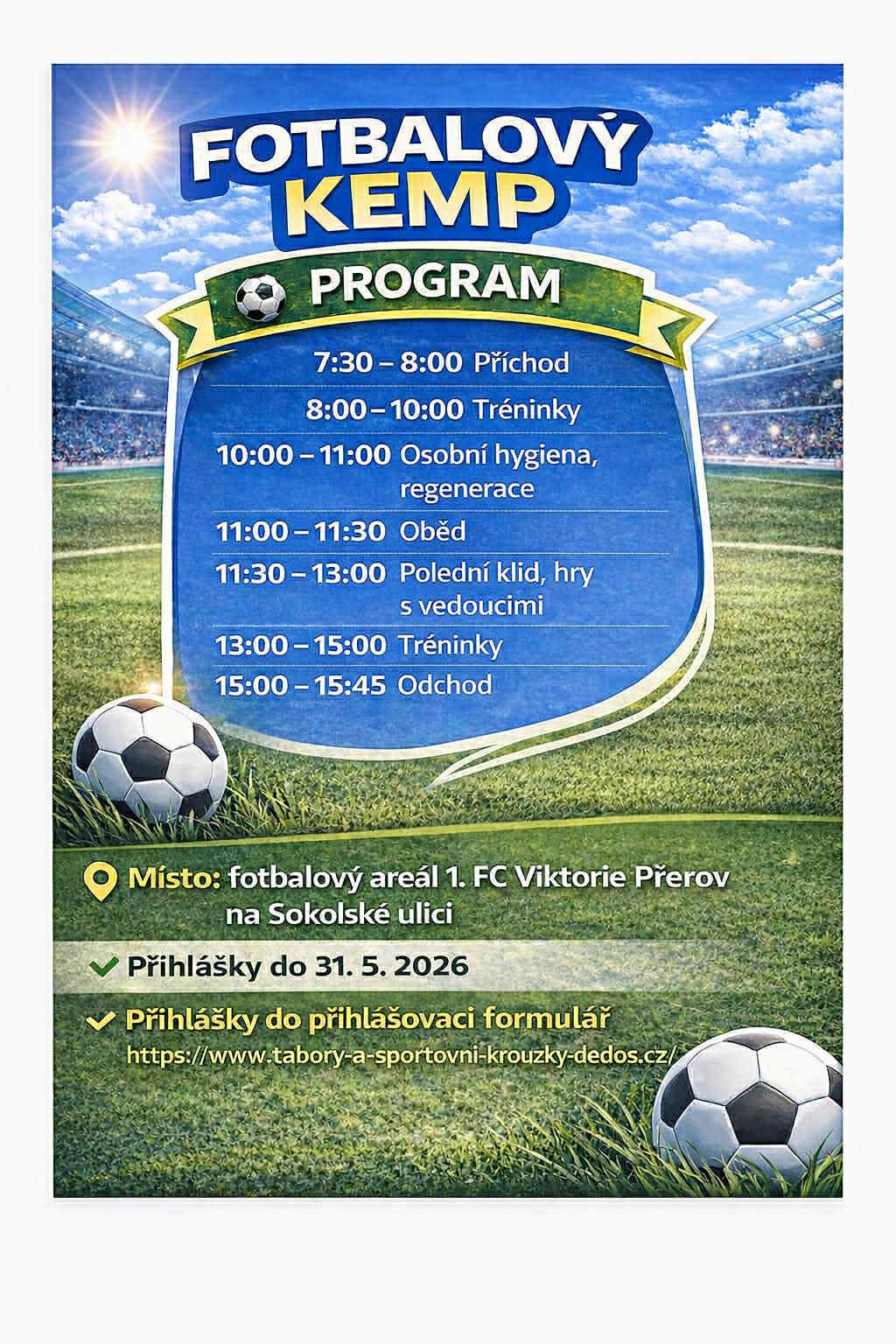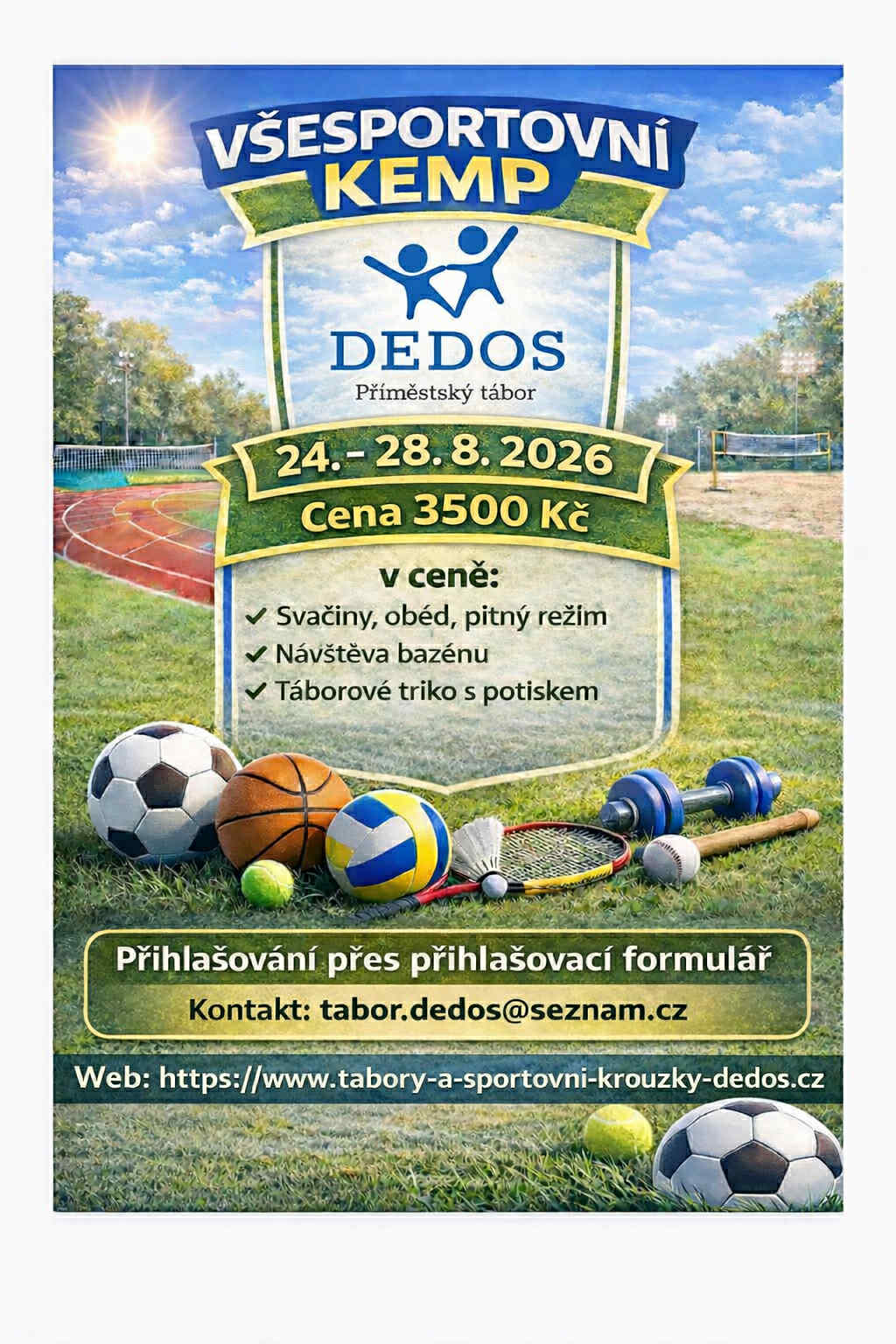 DEDOS pořádá sportovní kempy a nově i sportovní kroužky pro děti ve městě Přerov. Naše aktivity jsou zaměřené na rozvoj pohybových schopností, zdravého životního stylu a týmového ducha u dětí. V našich táborech a kroužcích se děti mohou zapojit do různých sportovních aktivit, jako je fotbal, tanec, basketbal, plavání, atletika, gymnastika, házená, cyklistika a mnoho dalších. V prázdninových měsících pořádáme příměstské sportovní kempy a to již 11 let. Od září 2024 provozujeme oblíbený všestranný sportovní kroužek pro děti. To vše za velmi výhodné ceny.